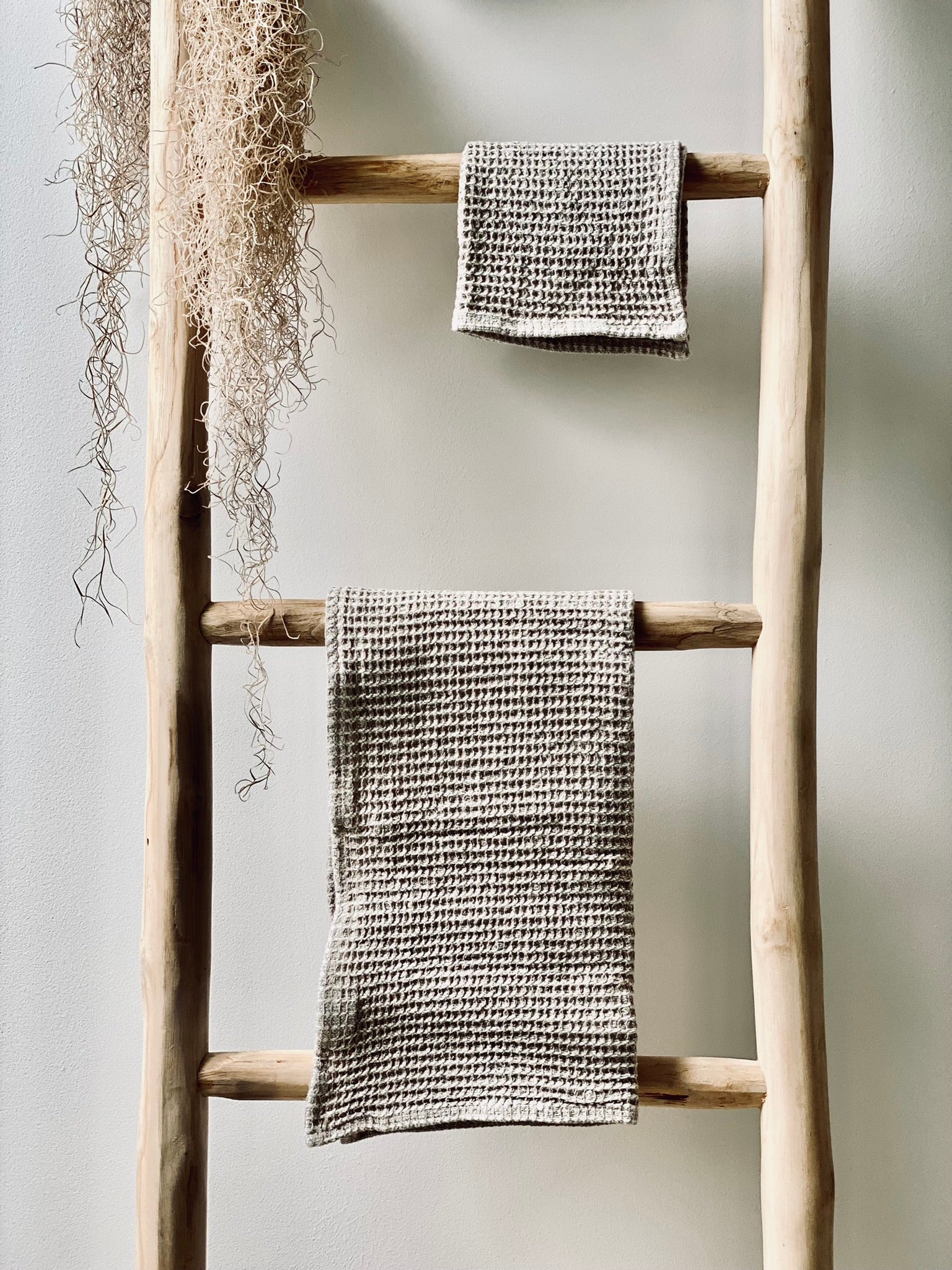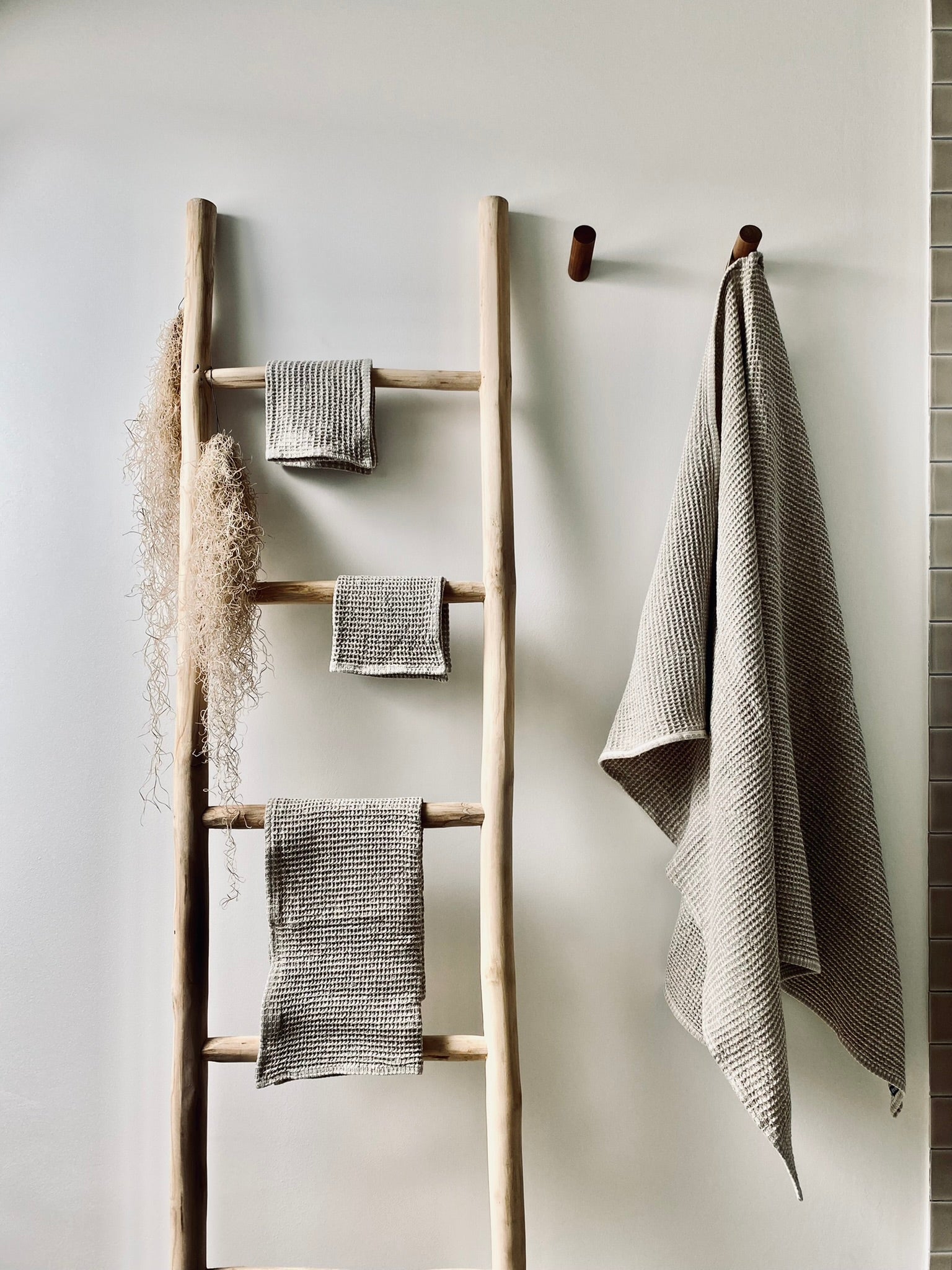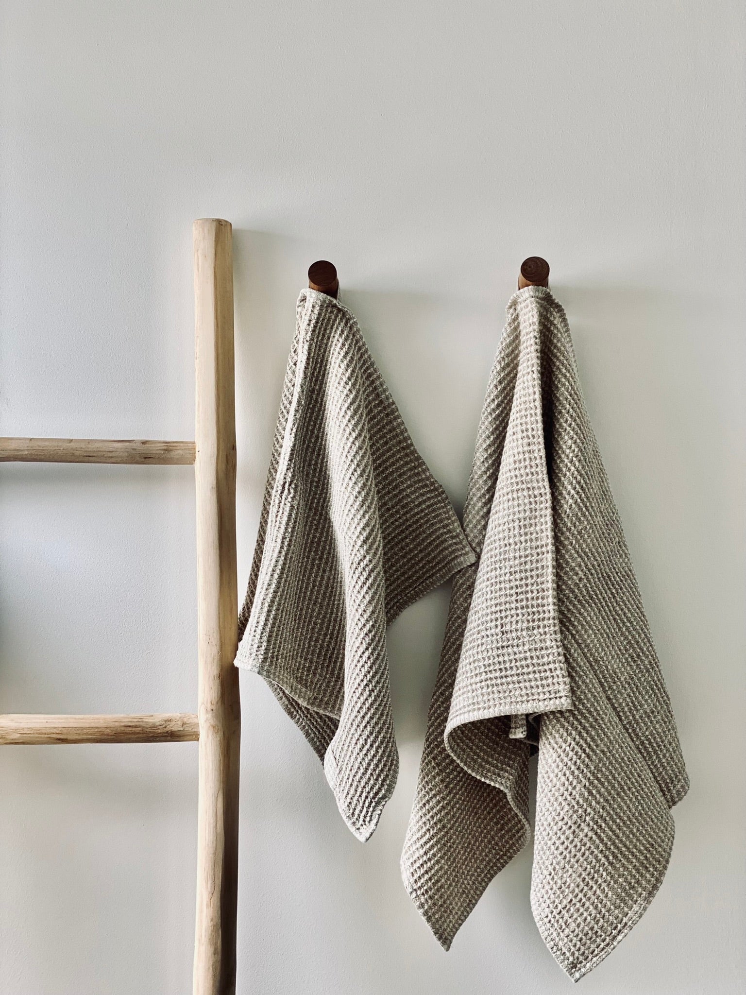 Towels and bath towels from do design copenhagen with a waffle pattern made from 100% linen. They are OEKO-TEX certified and have a small loop for easy hanging.