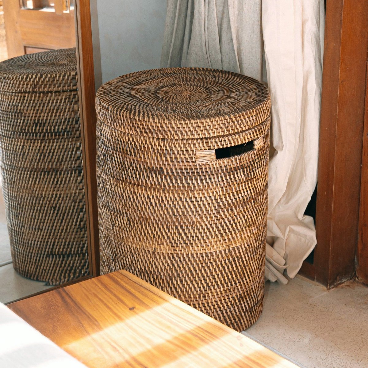 Jeder Korb ist ein einzigartiges Stück, das mit großer Liebe zum Detail handgefertigt ist. Der robuste natürliche Rattan stellt sicher, dass er im Laufe der Zeit seine Form hält, was es zu einem zuverlässigen Begleiter für den täglichen Gebrauch macht. Diskrete integrierte Griffe machen das Tragen einfach, während das atmungsaktive Gewebe einen ordnungsgemäßen Luftstrom ermöglicht - perfekt, um Wäsche frisch und trocken zu halten.