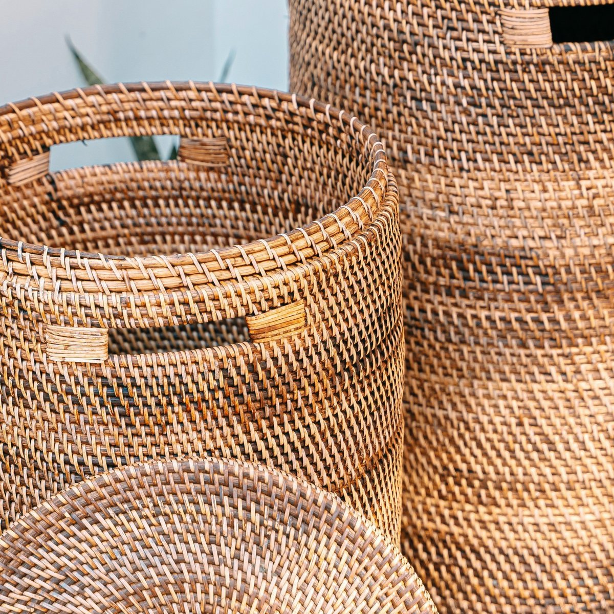 Die Körbe werden von erfahrenen Handwerkern auf der indonesischen Insel Lombok sorgfältig handgefertigt. Dicke Rattanfasern werden mit schmalen Rattanrindenstreifen zusammengewebt, wodurch eine robuste und dekorative Struktur erzeugt wird. Um die perfekt runde Form des Korbs zu erreichen, ist das Material um einen maßgeschneiderten Holzrahmen gewickelt, der seine Form und Größe definiert. Jeder Korb dauert ungefähr drei Stunden und erfordert ein hohes Maß an Geduld, Handwerkskunst und Liebe zum Detail.