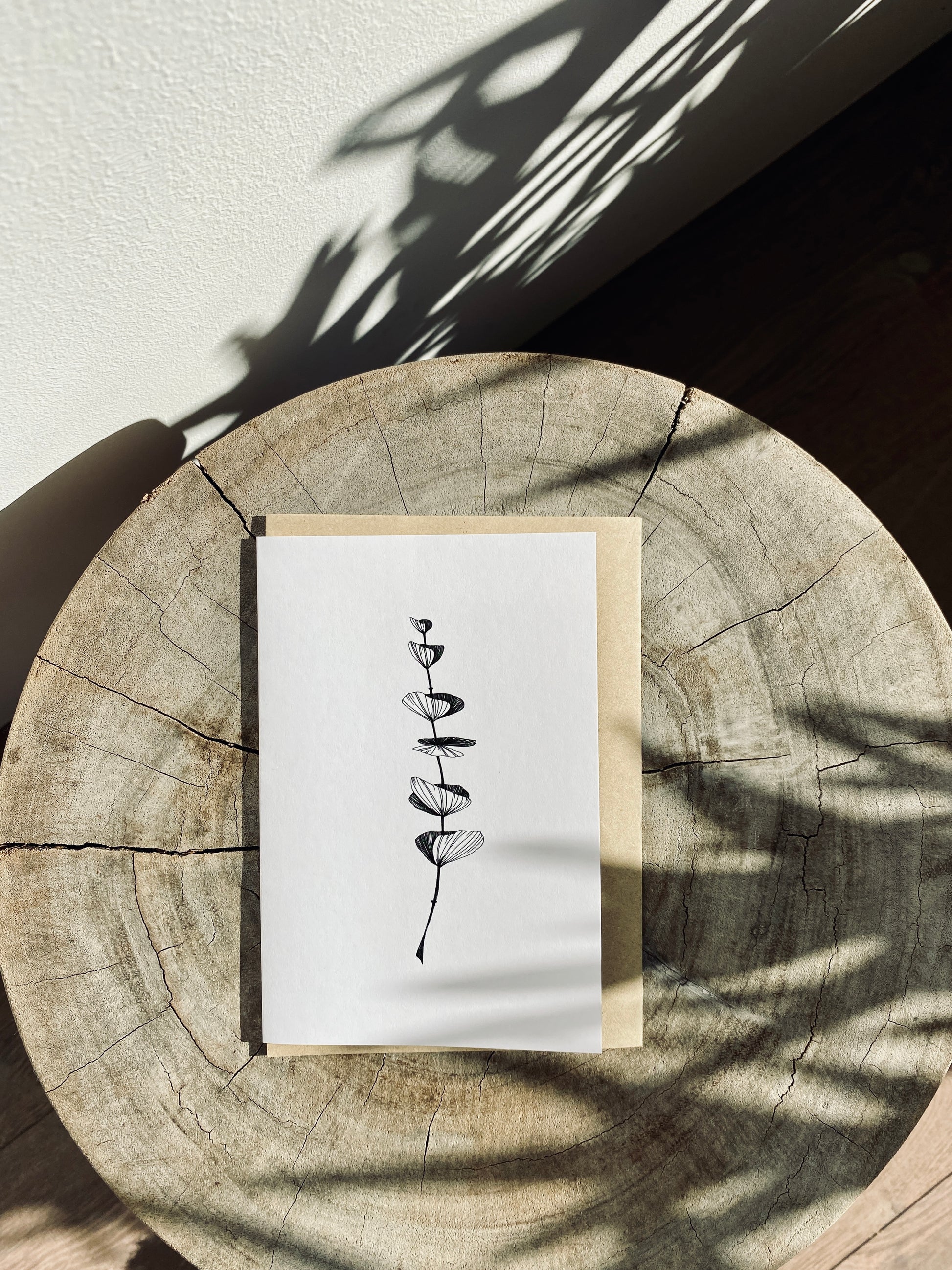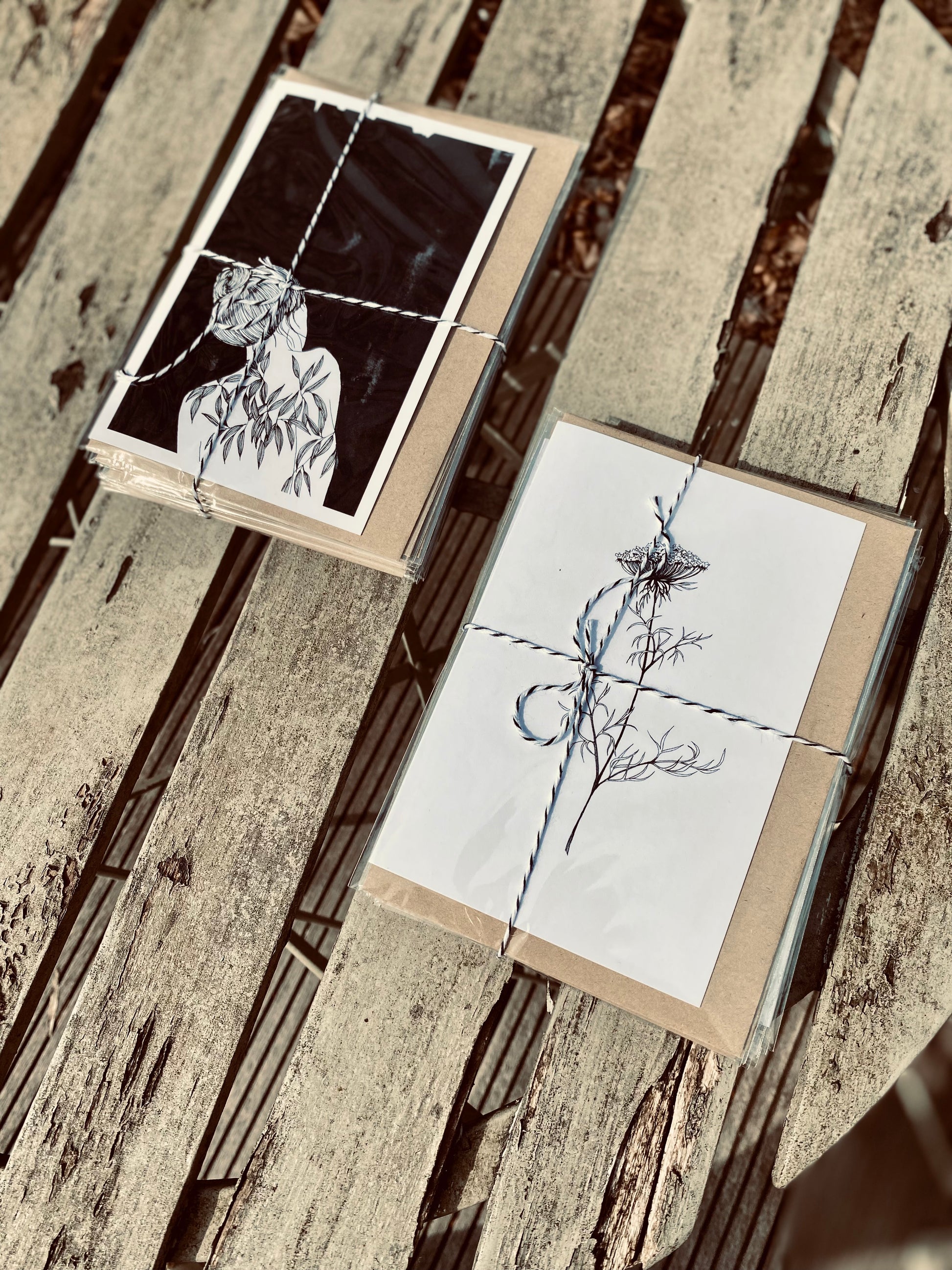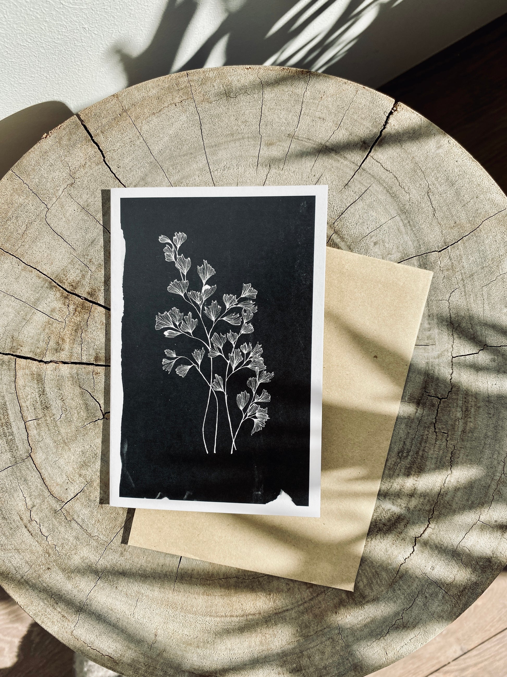 Doppelkarte 10x15cm, begleitet von einem Recycling-Kraft-Umschlag.