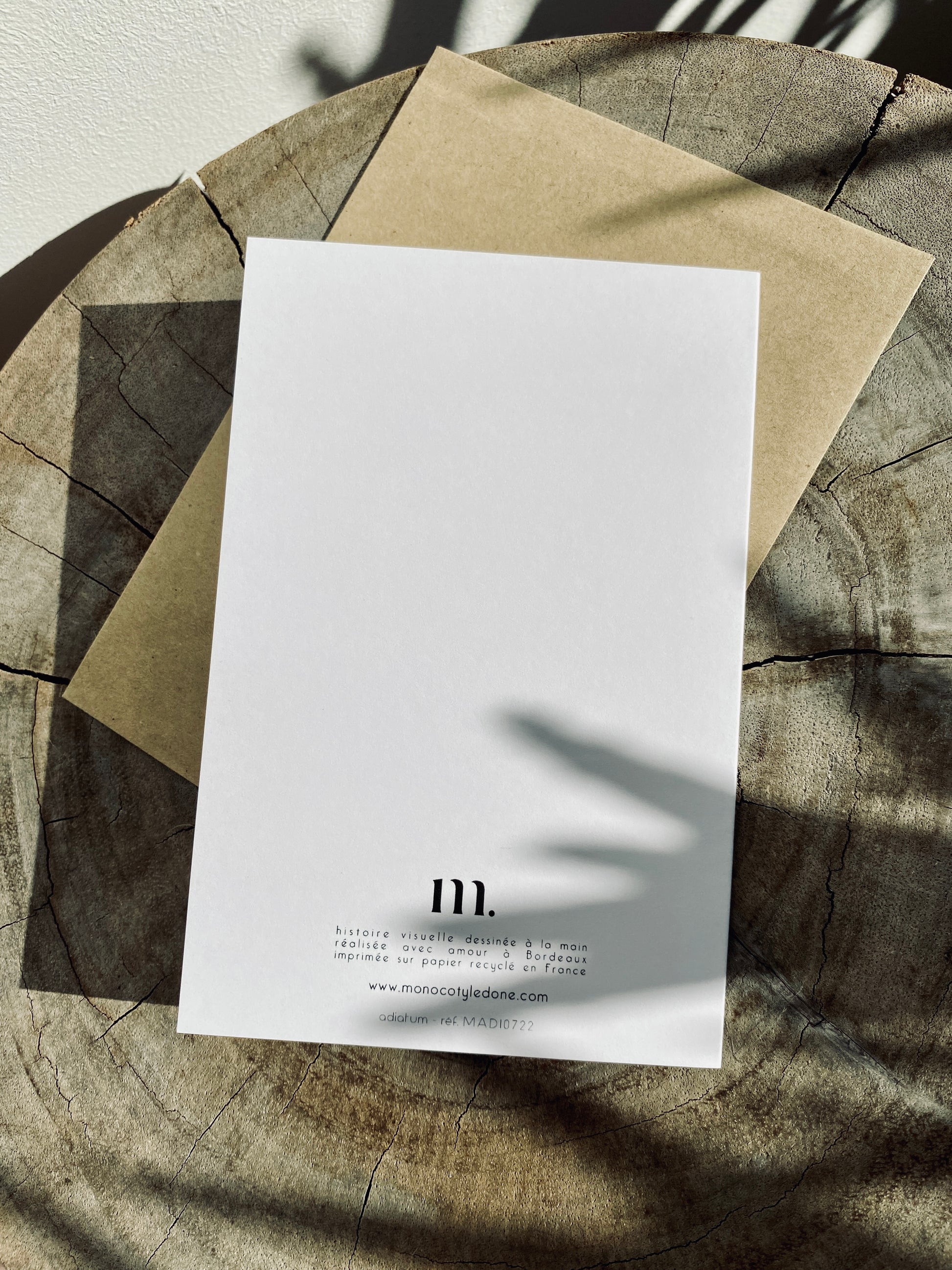monocotylédone ist eine Marke für grafische und poetische Schreibwaren, die mit Tusche gezeichnet sind. Mit ihren Zeichnungen bietet euch Virginie Lefebvre ein originelles Universum, das Geschichten erzählt, die von der Natur, dem einfachen Glück und der visuellen Flucht inspiriert sind.