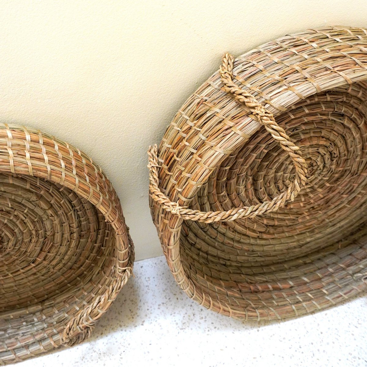 Pintu ist ein dekoratives Tablett mit einer einzigartigen Webart: Dünne Seegrasfasern werden zu dicken Strängen zusammengebunden und zu einem runden, erstaunlich stabilen Tablett zusammengefügt. Die langen Griffe aus gedrehtem Seegras runden das auffällige und charmante Design ab.
