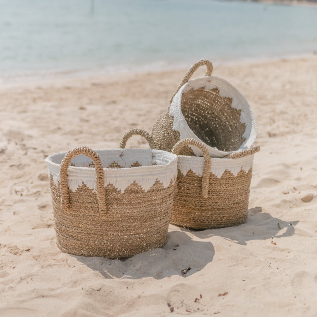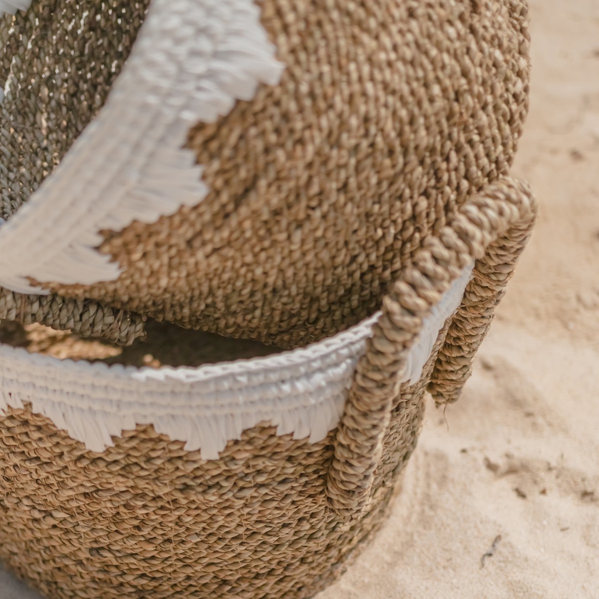 Waigeo ist ein zweifarbiger Korb aus einem einzigartigen Materialmix: Während für den unteren Teil Seegras verwendet wurde, besteht der obere Teil aus gewebten, weißen Baumwollbändern. Dieser leuchtende Farbtupfer macht den Korb zu einem echten Hingucker, der in jedem Raum einen schönen Kontrast zur restlichen Inneneinrichtung bildet.