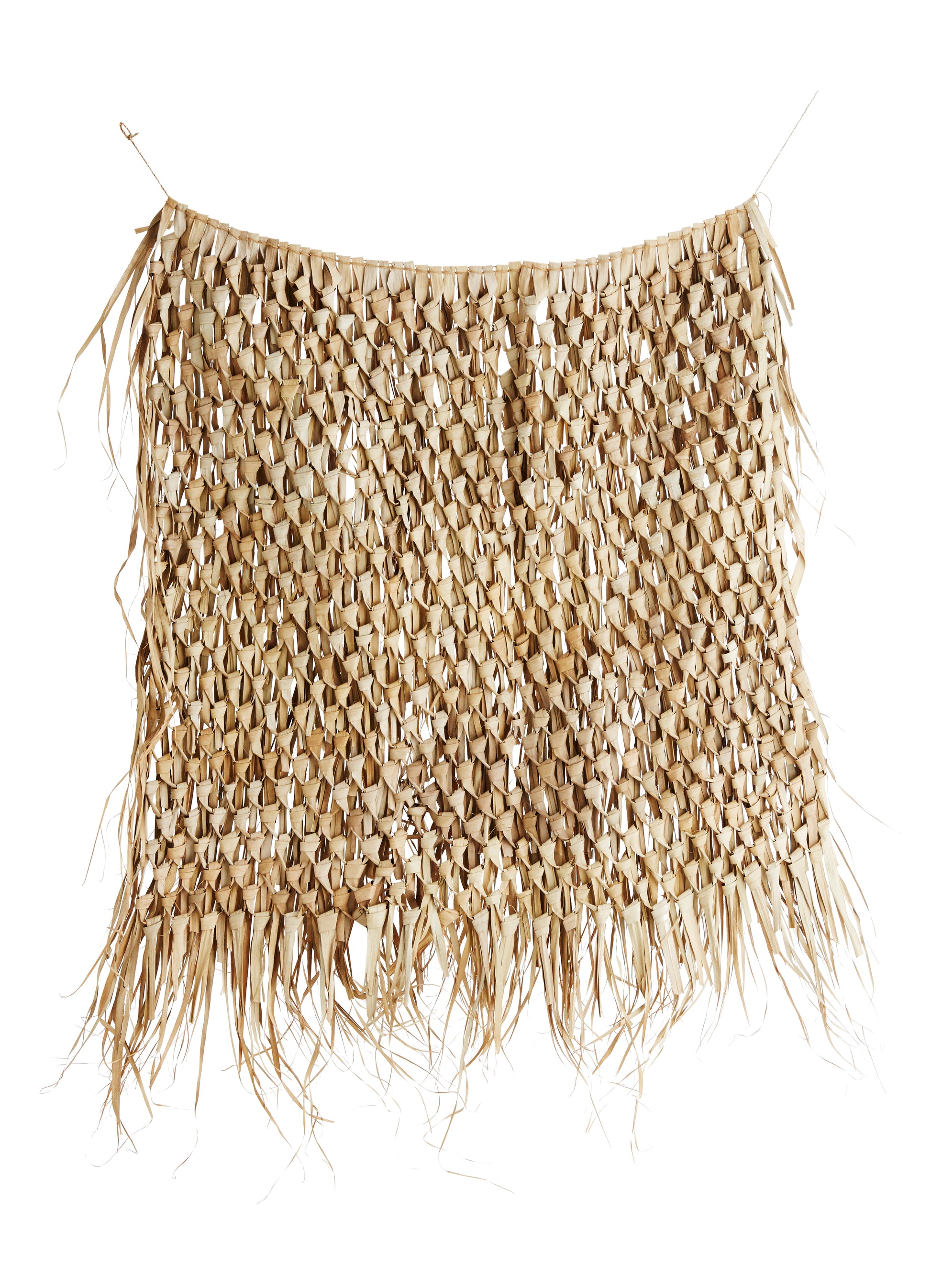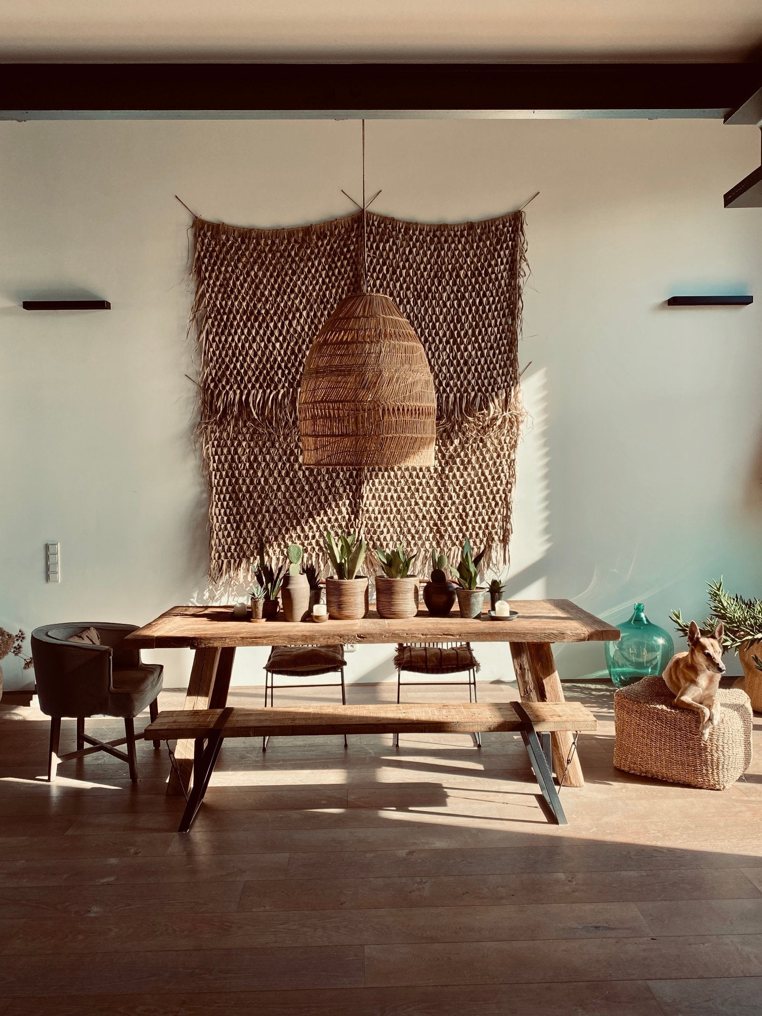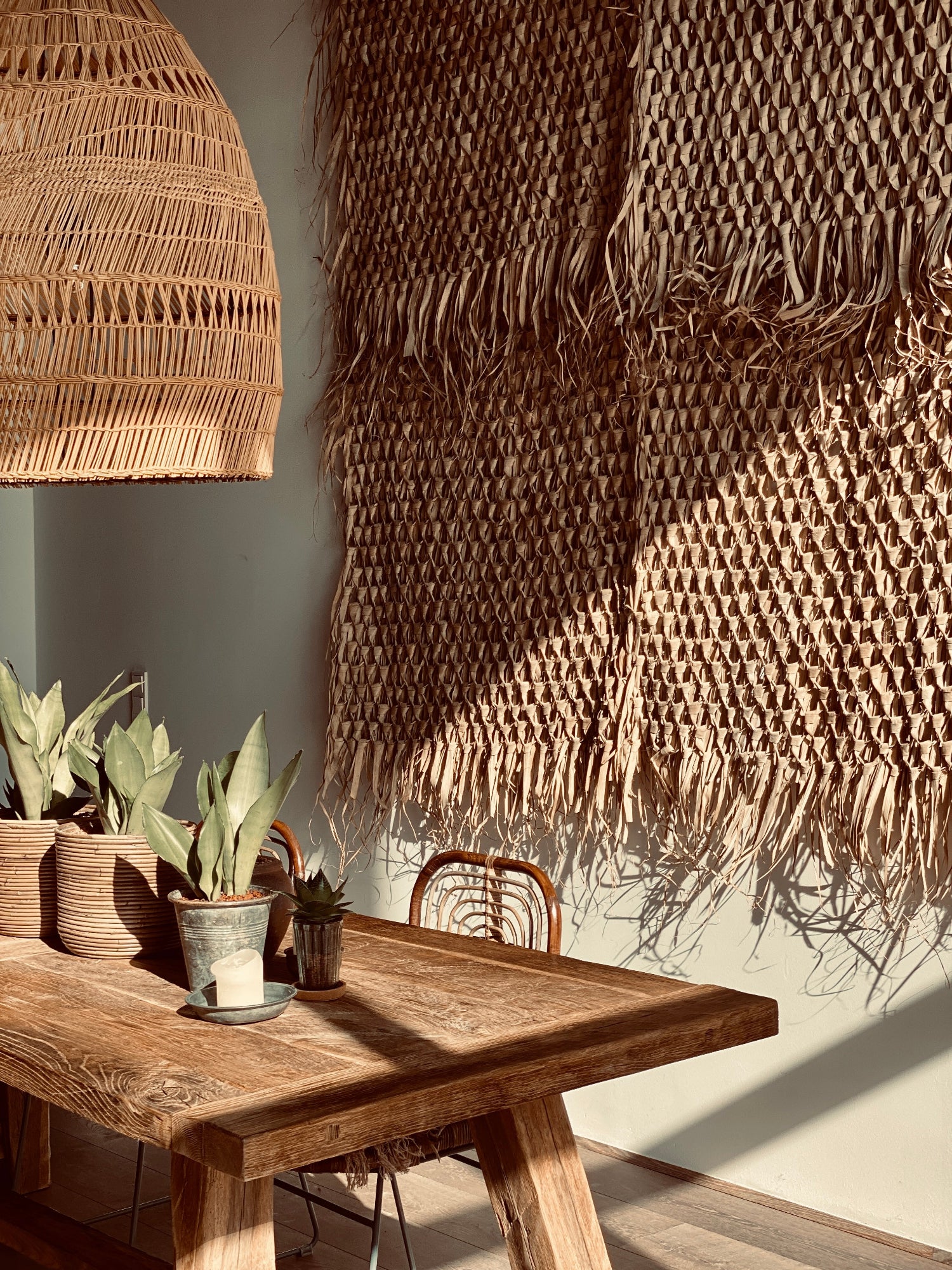 Die Wandbehang ist aus naturbelassenem Palmenblättern geflochten und die unteren Enden hängen einfach herab. Der Behang kann ganz einfach auf beiden Seiten an dem Jutestrick befestigt werden.